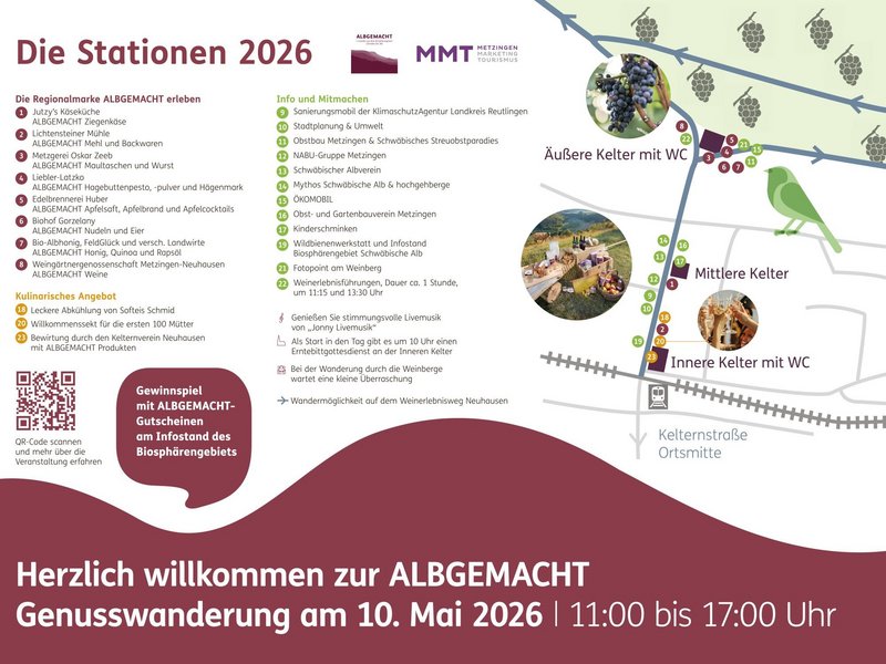 Das Jahr 2026 steht dabei ganz im Zeichen der wachsenden Produktvielfalt. Seit der letzten Genusswanderung im Jahr 2024 sind vier neue Betriebe zu Albgemacht dazugekommen, sodass es mittlerweile über 25 Produkte des täglichen Bedarfs (beispielsweise Kartoffeln, Brot und Mehl, Nudeln, Käse, Eier, Fleisch- und Wurstwaren, Öl und Honig), aber auch leckere Spezialitäten wie Weine, Säfte, Quinoa oder Hagebuttenprodukte, zu kaufen gibt.