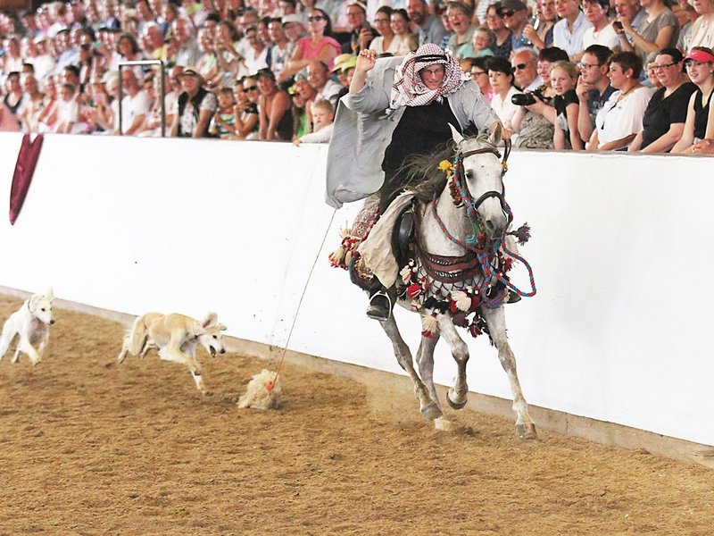 Ab 14 Uhr erwartet die Besucher in der großen Reithalle des Gestüts ein abwechslungsreiches rund eineinhalbstündiges Schauprogramm um das arabische Pferd, dessen vielfältige Nutzungsmöglichkeit und die Rassenvielfalt im Haupt- und Landgestüt Marbach. Auch in diesem Jahr verwandelt Meike Göbel mit ihren Vollblutarabern und Saluki Hunden die Halle in einen „Wüstenzauber“. Außerdem wird bereits an diesem Tag das diesjährige Gastland der Hengstparaden von der Voltigiergruppe mit den „spanischen Tänzen“ begrüßt. Neben edlen Vollblutaraberhengsten an der Hand werden auch Youngster, von denen einige zum Verkauf stehen, unter dem Sattel präsentiert. Das Highlight: Zum ersten Mal wird es eine rasante Indoor Vielseitigkeit geben. Auch der „Schnellste Schecke der Welt“, Publikumsliebling SILVERY MOON xx, darf bei einer solchen Veranstaltung nicht fehlen. Und zu guter Letzt wird der Tag von der traditionellen Marbacher „Silbernen Herde“ beendet. Das war natürlich nicht alles, lassen Sie sich überraschen!