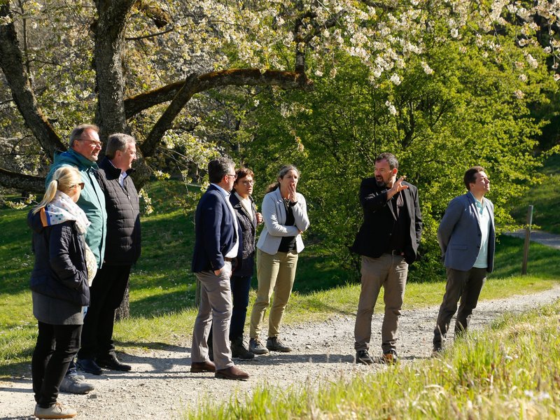 Mit Blick über die blühenden Streuobstwiesen begrüßten der Vorsitzende des Verein Schwäbisches Streuobstparadieses Oberbürgermeister Michael Bulander (Stadt Mössingen) und Landrat Joachim Walter (Landkreis Tübingen) die Gäste. Bei einem Streuobstspaziergang wurden verschiedene Streuobstprojekte, sowie das Streuobst-Infozentrum in der Stadtmitte vorgestellt. Hierbei ging es vor Allem um den Stellenwert der Vernetzung verschiedenster Institutionen beim Thema Streuobst, welcher durch praktische Beispiele vor Ort verdeutlicht wurde.