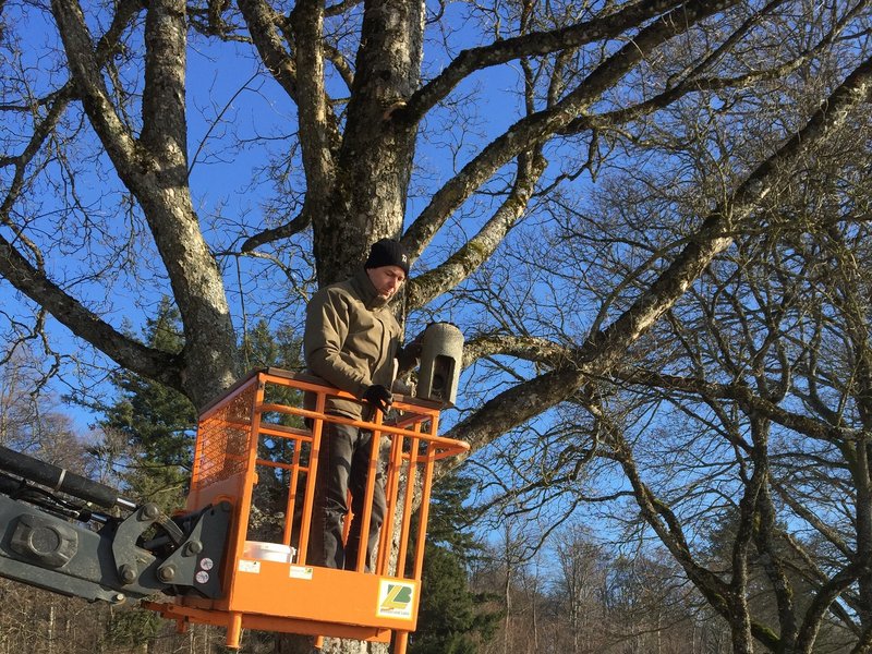 Peter Friedrich gibt ein Handzeichen an den Fahrer des großen Traktors, Christoph Heideker, aus dem Bereich Landwirtschaft, der behutsam und zentimetergenau den Arbeitskorb mit Peter Friedrich hinaufhebt, direkt an den nächsten Fledermausrundkasten. „Früher bin ich mit einer Leiter von Baum zu Baum gelaufen und hochgeklettert, aber das war so anstrengend, dass ich abends fix und alle war – und gefährlich war es obendrein“, erinnert sich Peter Friedrich an die Anfangsjahre der Kästenreinigung.“ Beim Reinigen geht Friedrich sehr vorsichtig vor – nicht ausgeschlossen, dass doch mal ein Siebenschläfer oder ein anderes Tier sich darin befindet. Die durch die Säuberungsaktion aufgeweckte „Flachstreckerspinne“, wie Friedrich sie fachkundig benennen kann, wird wieder vorsichtig in den Kasten zurückgesetzt. Ebenso die Puppe eines Falters, die beim Reinigen versehentlich aus dem Kasten auf den Boden gefallen ist. Peter Friedrich lässt den Arbeitskorb herunterfahren und sucht solange am Boden, bis er sie wiederfindet, wie eine Nadel im Heuhaufen! Ein Erfolg, denn die Puppe wird von ihm gefunden und wieder in den Kasten gelegt. Trotz dieser Geduld und Fürsorge für jedes Tierchen arbeitet Peter Friedrich zügig und fast wie im Akkord – auch um seinen Kollegen Christoph Heideker im Traktor möglichst nicht zu lange von seiner Arbeit auf dem Gestütshof abzuhalten.