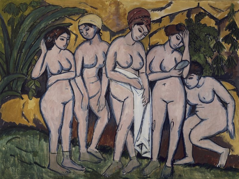 Ein weiterer Höhepunkt der Ausstellung ist das selten ausgestellte großformatige Ölgemälde „Frauen im Bade“ (1911), dessen exotische Sinnlichkeit auf die indische Malkunst der Ajanta des 6. Jahrhunderts zurückgeht, die für Kirchner Kraft und Natur zum Ausdruck bringt.