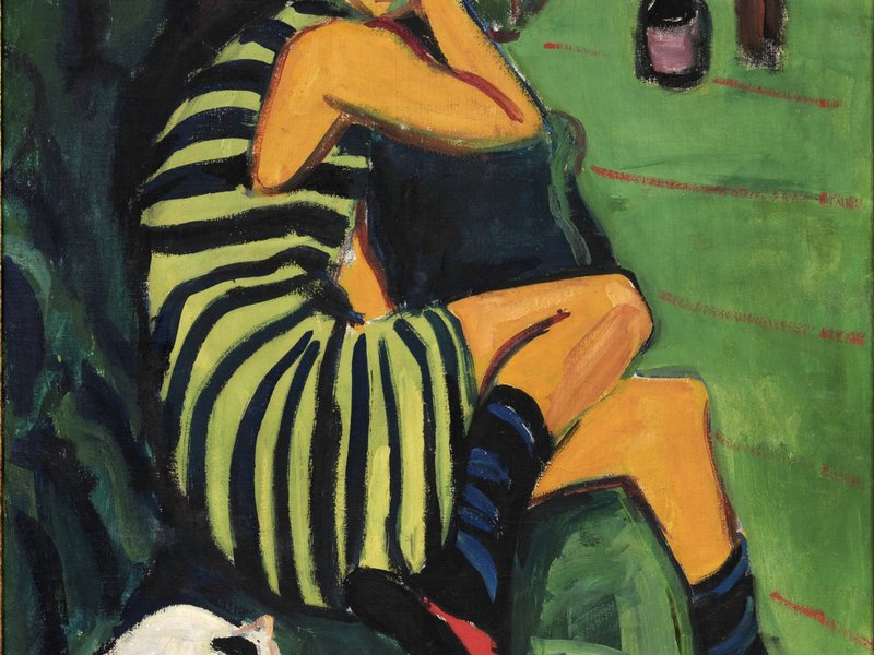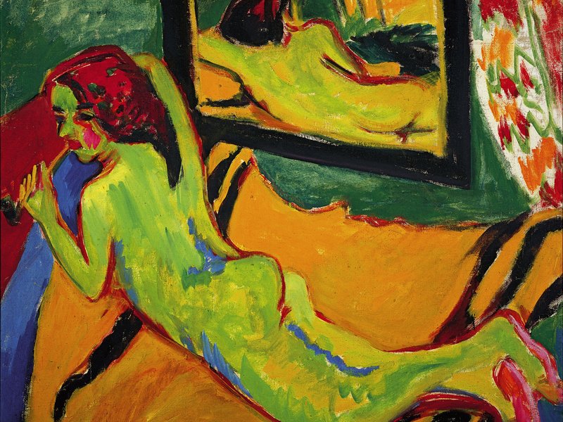 Mehr als 100 Jahre ist es her, dass Kirchner als Initiator der Künstlergemeinschaft „Brücke“ (1905-1913) mit einer neuen flächig farbigen Malerei, Holzschnitten und dynamischen Zeichnungen die akademische Tradition aus den Angeln hob und nach höchster Authentizität des emotionalen Ausdrucks strebte. Gemälde wie „Aristin-Marcella“ (1910) im gestreiften Badeshirt aus der „Brücke“-Zeit oder das große, selten zu sehende Gemälde „Frauen im Bade“ (1911) sowie die Kokotten „Im Cafégarten“ (1914), oder der „Rückenakt mit Spiegel und Mann“ (1912), um nur einige zu nennen, sind Meisterwerke des Expressionismus.