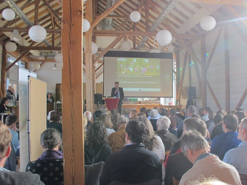 Landwirtschaftliche Vertreterinnen und Vertreter, ökologisches Fachpublikum und interessierte Bürgerinnen und Bürger trafen sich vergangene Woche in Münsingen zum ersten Zukunftsforum Biosphärengebiet Schwäbische Alb. Zum Schwerpunktthema „Insektensterben stoppen, Biodiversität erhalten“ haben sie sich über die Zukunft der Landwirtschaft im Biosphärengebiet ausgetauscht und verschiedene Ansätze diskutiert. Die Festscheune auf dem Hofgut Hopfenburg war mit über 100 Teilnehmern bis auf den letzten Platz gefüllt.