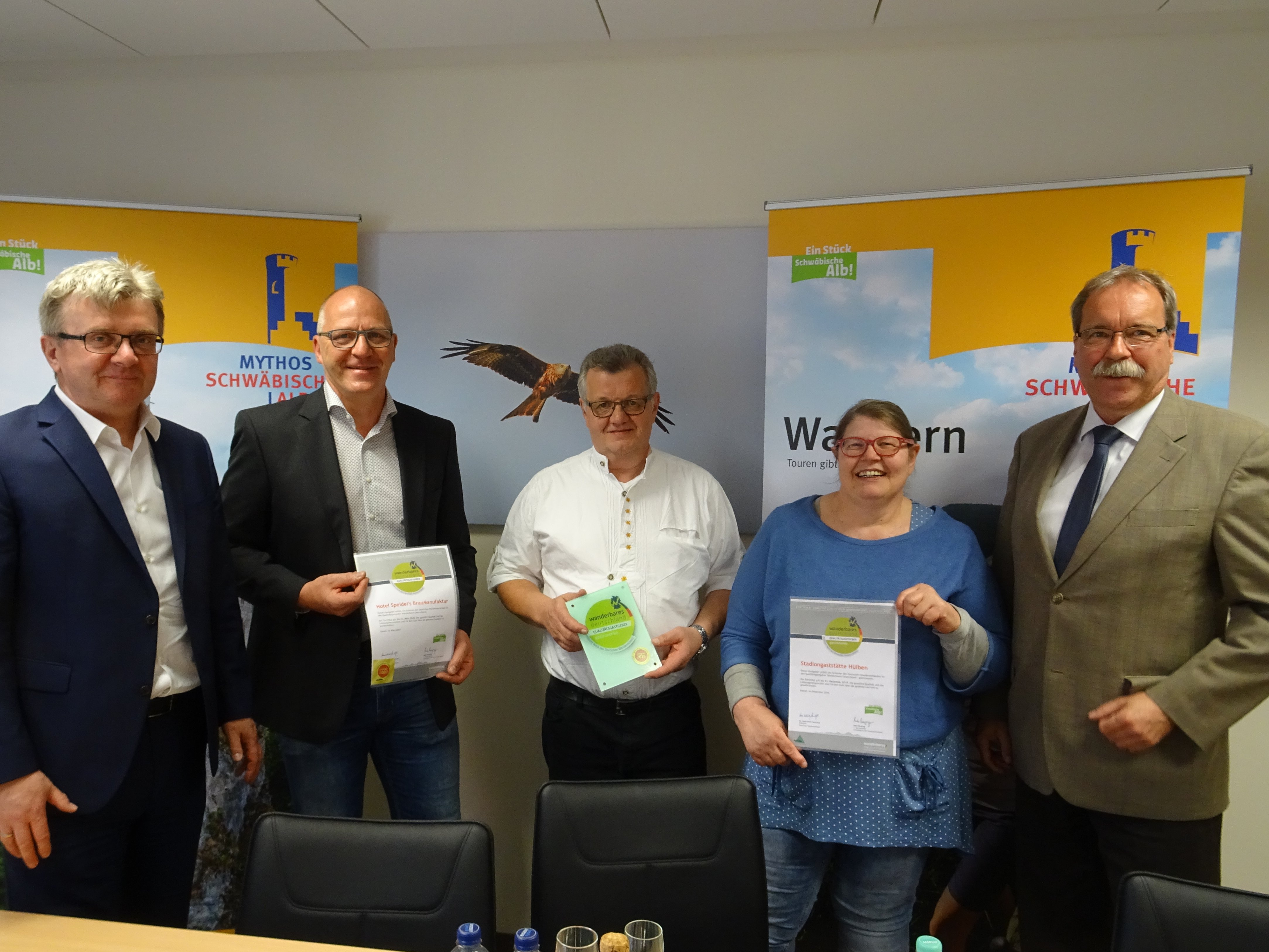 Das Thema Wandern sei eines der Kerngeschäftsfelder des Tourismusverbandes Schwäbische Alb und benötige transparente Qualität für die Gäste. Die Urkunde und ein Plexiglasschild am Eingang ist für Wanderer das sichtbare Erkennungsmerkmal für überprüfte Qualität und für optimale Voraussetzungen für einen gelungenen Urlaub. Mythos Geschäftsführer Wolfgang Schütz betonte die Notwendigkeit, dass das Angebot an Wanderwegen durch engagierte Gastgeber untermauert werde. Gäste orientieren sich an Siegeln, die zielgruppenspezifische Qualität garantieren. Er bedankte sich bei den Gastgebern für deren Arbeit und wünschte für die Zukunft viel Erfolg und begeisterte Gäste.