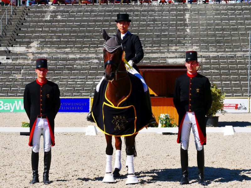 Internationales Flair war in der Marbacher Hengstparadearena zu spüren, als der Südkoreaner und amtierende baden-württembergische Landesmeister Young Shik Hwang (RFV Herbertingen) mit Destino ins Dressurviereck ritt. Mit viel Feingefühl und Geschick lieferte er mit über 70 Prozent im Grand Prix de Dressage, der zweitschwersten internationalen Dressurprüfung, eine souveräne Runde ab. Matthias Kempkes (RA München) piaffierte mit Ricoletto auf Rang zwei, gefolgt von Rubicon Leonardo, der von Jakob Hetzel (RSC Danielshof Moers) vorgestellt wurde.