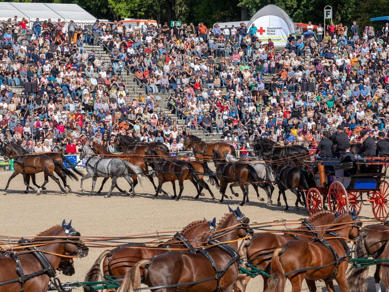 Programm-Höhepunkte sind unter anderem das Schaubild mit sechs imposanten Zehnspännern, also Kutschen, die jeweils von zehn Pferden gezogen werden, eine Vorführung mit rasanten römischen Kampfwagen und die große Marbacher Dressurquadrille mit zwölf Warmblut-Hengsten des Haupt- und Landgestüts Marbach sowie vier Freiberger Hengsten des Schweizerischen Nationalgestüts Avenches.