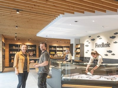 Es ist die erste Forellerie der Welt, der Name ist neu erfunden. Der französische Klang (Boulangerie, Patisserie, Destillerie) lässt an feine Geschmackserlebnisse denken, an frisch zubereitete Feinkost. Zugleich stellt er das Herz des Forellenhofs in den Mittelpunkt: Die Echaztal-Forellen. Sie und die Saiblinge gibt es hier in jeder Form, fangfrisch im Ganzen oder als Filet, geräuchert oder eingelegt. Auch im Salat oder in Maultaschen geben die Fische ein feines Aroma.