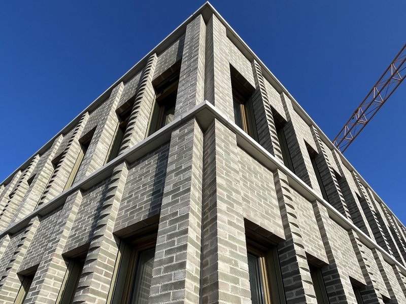 Die beiden zurückgesetzten Staffelgeschosse im niedrigeren 5-geschossigen Gebäudeteil sind bereits abgerüstet, so dass die fertiggestellte fassettenreiche Klinker-Fassade von den umgebenden Straßen aus sichtbar ist. Für Passantinnen und Passanten zeigt sich hier schon eindrücklich das finale Erscheinungsbild des Landratsamts.