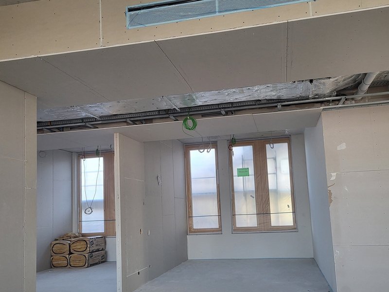 Auch die Ausbaugewerke, wie zum Beispiel die Trockenbauarbeiten, sind schon auf vielen Etagen im Gange. In den oberen Geschossen werden die Wände gespachtelt und der Hohlraumboden verlegt, auf welchem schon die ersten Gipskartonwände stehen. Diese bilden später die Trennung der einzelnen Büroeinheiten.