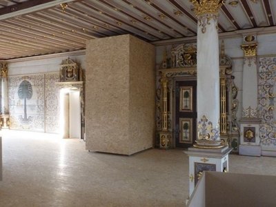 Im Goldenen Saal arbeitet dagegen ein Restaurator der Staatlichen Schlösser und Gärten daran, die beiden Renaissanceportale und die Holzverkleidungen der Säulen in ihre Einzelteile zu zerlegen. In Kisten verpackt ruhen sie dort bis zu ihrem Wiedereinbau. Der wertvolle Ofen ist schon seit längerem hinter einer Holzverkleidung verschwunden, damit auch er während des Umbaus keinen Schaden nehmen kann.