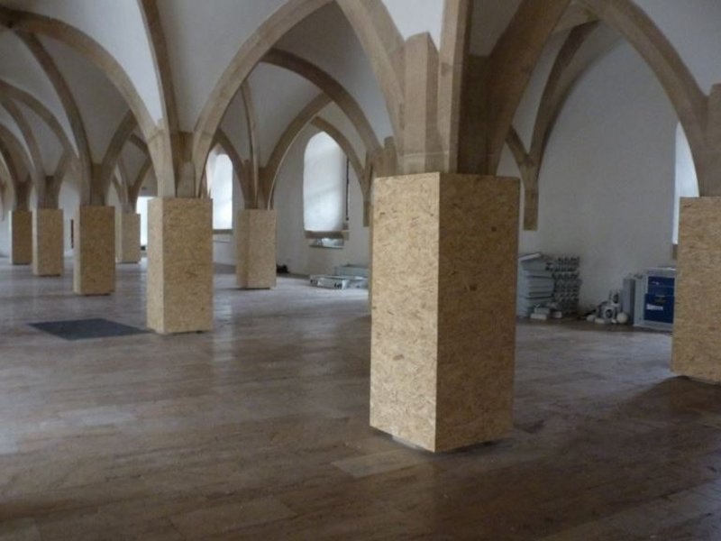 An Stelle von Schlossbesuchern sind jetzt also die Handwerker in den Schlossräumen unterwegs. Schreiner entfernen und entsorgen die festen Einbauten wie Schränke oder die Theke. Schützenswerte Bauelemente, allen voran die Wandmalereien im Palmensaal und die steinernen Säulen in der Dürnitz, werden fachmännisch von ihnen abgedeckt und hinter Holzplatten gesichert. Auch auf den Fußböden verlegen sie einige hundert Quadratmeter Holzplatten. Diese Maßnahmen dienen dem Schutz während der Umbauzeit.