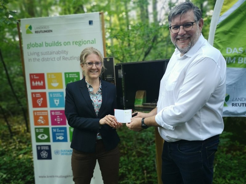Das erste von 17 GeoTürle im Landkreis Reutlingen wurde von Landrat Dr. Ulrich Fiedler (Landrat im Landkreis Reutlingen) und Dr. Sandra Teuber (Geopark-Geschäftsführerin) gemeinsam geöffnet. Der Geocache liegt am Forsthof in Metzingen mitten im Wald und befasst sich Land . Insgesamt sind 17 Geocaches quer über das Landkreisgebiet verteilt. Jeder Geocache ist einem der 17 Nachhaltigkeitsziele der Vereinten Nationen zugeordnet (Sustainable Development Goals = SDGs). Über ein Rätsel und eine kleine Info-Tafel, die sich in einem Holzkasten befinden, wird das SDG und der lokale Bezug vorgestellt.