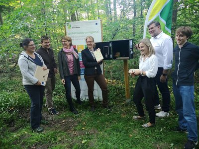 Anders als sonst üblich, sind die Geocaches nicht versteckt. So kann jeder, der am Cache vorbeikommt, das Angebot spontan per QR-Code nutzen und kommt spielerisch mit dem Thema Nachhaltigkeit in Verbindung. Landrat Dr. Ulrich Fiedler freut engagierte Hände ineinandergegriffen.