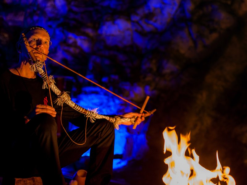 Eiszeitliche Flöten aus Mammutelfenbein und Hirschknochen, Schamanentrommeln, klingende Steine und Musikbögen stehen im Mittelpunkt der Konzerte, die Christoph Haas, ein Pionier archaischer Musik, im Hohle Fels gibt.