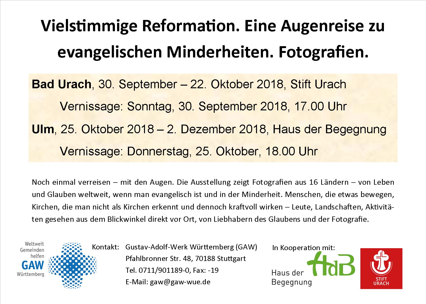 Fotografien aus 16 Ländern zum Thema „ Vielstimmige Reformation“ sind vom 30.09. – 22.10.2018 in Stift Urach zu sehen. Eröffnet wird die Ausstellung mit einer Vernissage am Sonntag, 30. September um 17 Uhr.