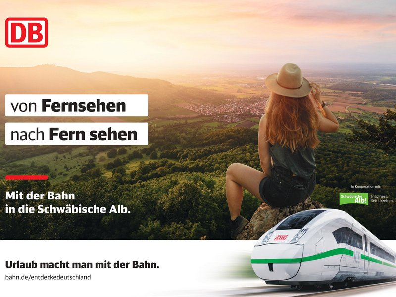 Sonnenuntergang am Albtrauf: der Blick schweift über die Felsen und den sattgrünen Buchenwald zur Burg Teck und weit ins Albvorland. Dieses Plakatmotiv der Schwäbischen Alb ist dank der Werbemaßnahme in insgesamt acht Metropolen Deutschlands omnipräsent, egal, ob Frankfurt, Köln, Hamburg oder Berlin. Eine umfangreiche Online-Kampagne mit Kurzfilmen, insbesondere auf Youtube und anderen Social-Media-Plattformen, verstärkt den Werbeeffekt für die Urlaubsregion. Die DB Fernverkehr hat hierfür die Webseite www.entdecke-deutschland-bahn.de aufgebaut und die Schwäbische Alb prominent eingebunden.