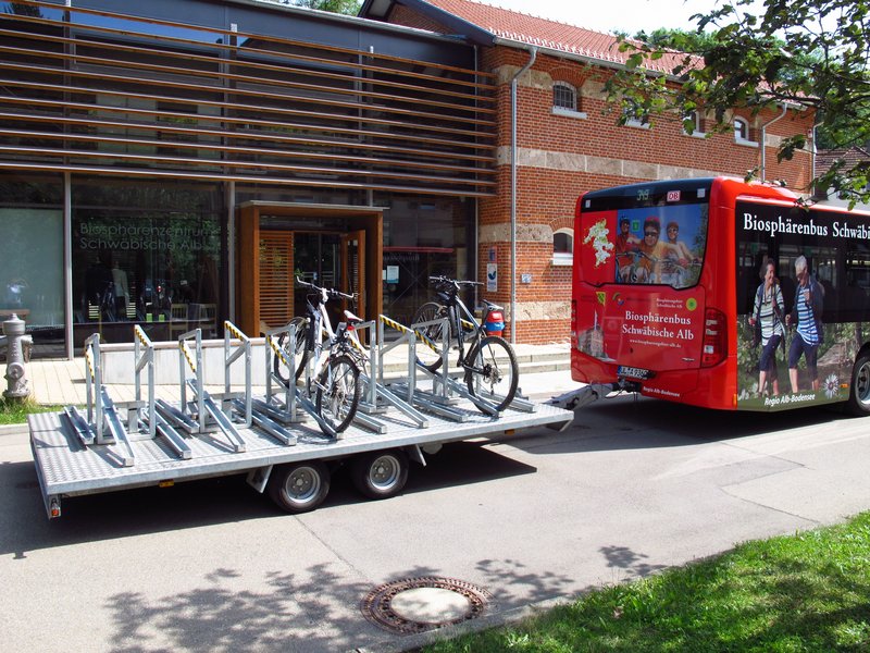 In Münsingen werden die Anschlüsse der Schwäbischen Alb-Bahn aus Richtung Ulm/Schelklingen und Engstingen sowie die Rad-Wanderbusse aus Bad Urach und ins Lautertal aufgenommen. Der Biosphärenbus ist Teil des naldo-Freizeit-Netzes. Das ist ein ÖPNV-Netz von Bahnen und Bussen, die vom 1. Mai bis 15. Oktober 2017 sonn- und feiertags in den vier naldo-Landkreisen Reutlingen, Tübingen, Sigmaringen und dem Zollernalbkreis verkehren. Vielfach sind spezielle Fahrradzüge und -busse unterwegs, in denen eine kostenlose Fahrradmitnahme möglich ist. Für Wanderer und Radfahrer bieten sich unzählige Tourenmöglichkeiten in einer herrlichen Landschaft. Die Route des Biosphärenbusses sowie einzelne Tourenvorschläge sind in dem Flyer "Biosphärenbus Schwäbische Alb" unter http://biosphaerengebiet-alb.de/images/lebensraum/2017_Flyer-Biosphaerenbus-Web.pdf einsehbar.